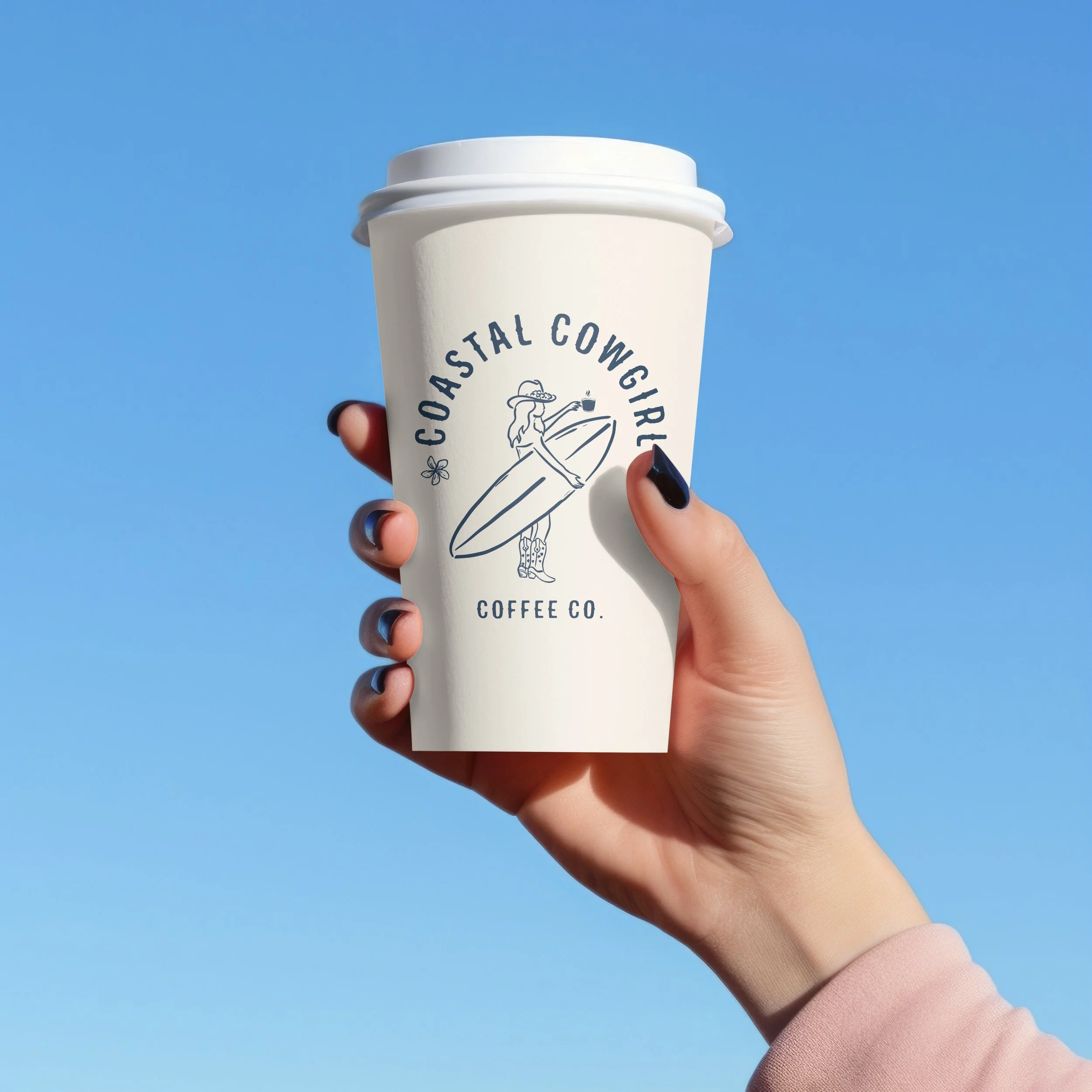 Furthermore, the illustration of the cowgirl holding a coffee cup, alongside the surfboard logo, embodies a unique fusion of coastal culture and the adventurous spirit of the West. This imagery not only highlights the laid-back lifestyle associated with both surfing and coffee enjoyment but also connects with a diverse audience who appreciate both the beach and rustic charm. By blending these elements, the design aims to create a strong sense of place and lifestyle, inviting customers to experience the essence of relaxation and enjoyment that our coffee embodies.
